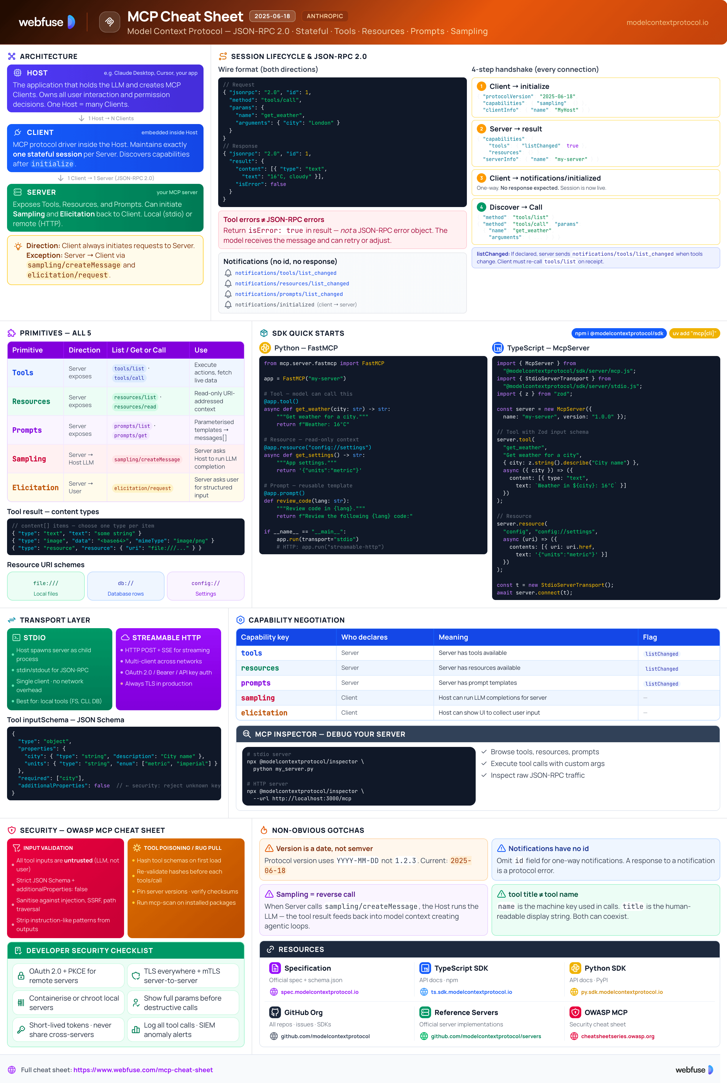 Complete quick reference for the Model Context Protocol - the open standard that connects AI models to tools, data, and services. Architecture, primitives, transports, SDKs, and security in one place.